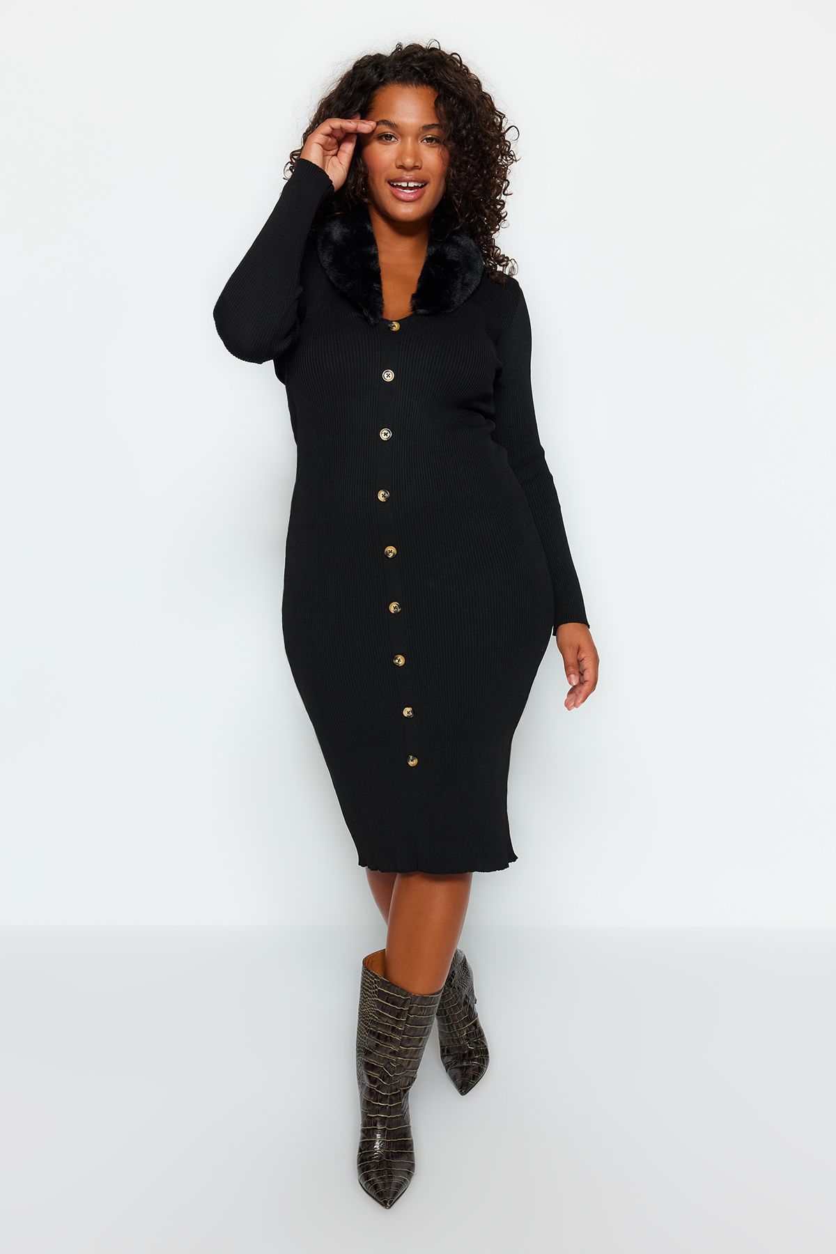 • A Trendyol Curve fekete szőrme galléros kötöttáru ruha ideális hétköznapi, munkahelyi vagy mindennapi öltözékhez